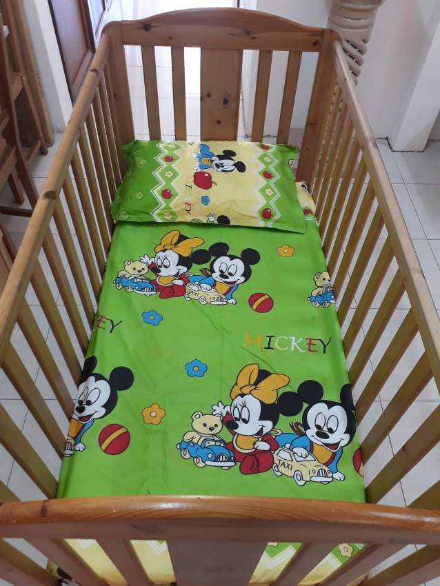 Berceau comprenant matelas, drap et taie d'oreiller. Peut aussi etre converti en lit simple pour enfant.