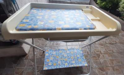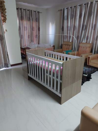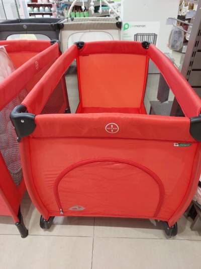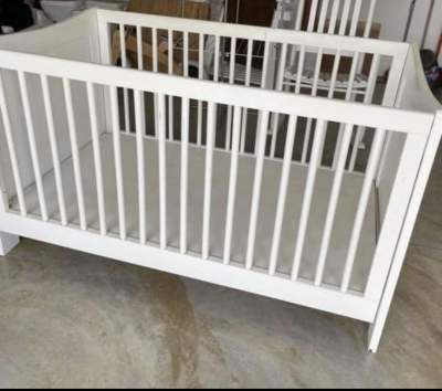 Fairly new, used for only 2 months. Comes with nappy changing top, new mattress and net.